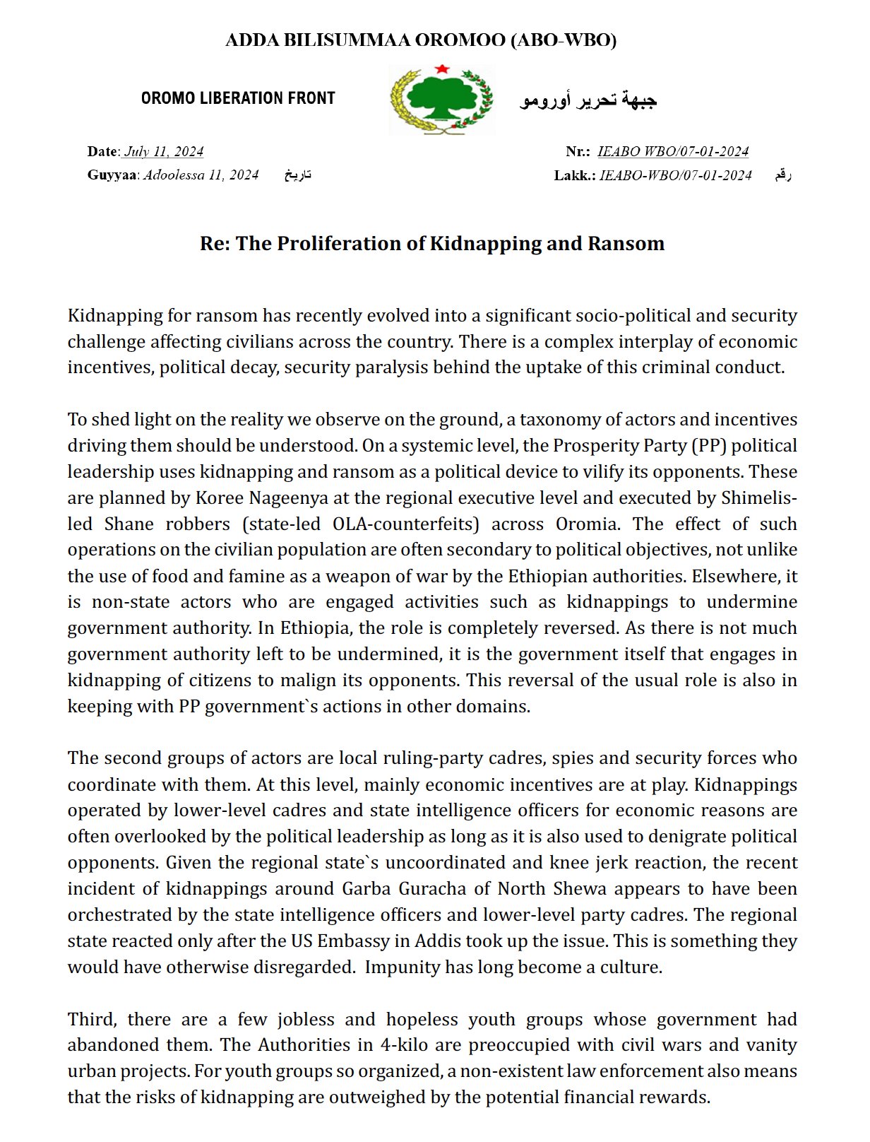 ردت الجبهة الشعبية لتحرير الأورومو الأثيوبية، عن الأخبار المتداولة بشأن عمليات الخطف والابتزاز الذي يتعرض له المواطنين والنازحين السودانيين في أديس أبابا.