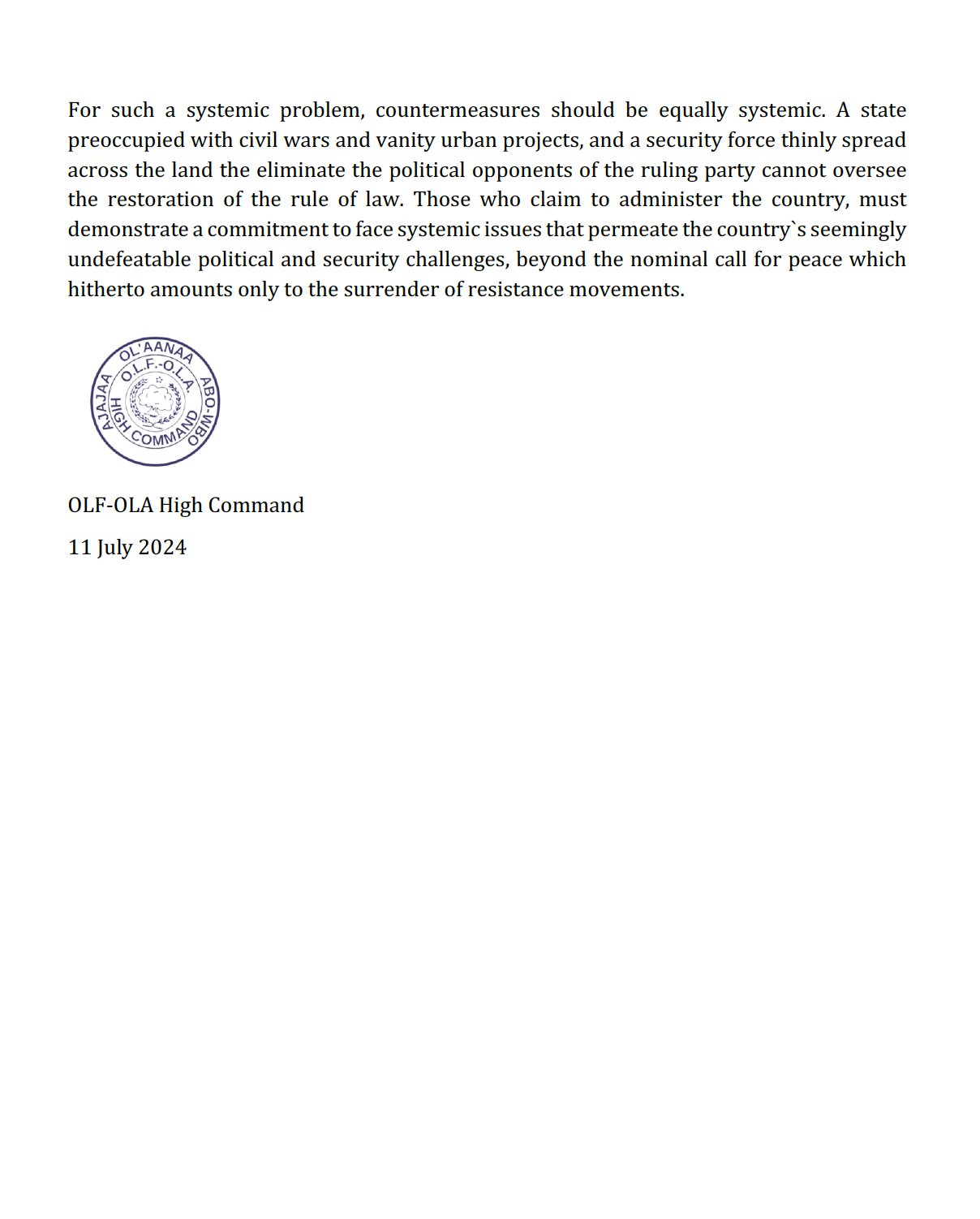الدولة) عبر أوروميا”، وغالباً ما يكون تأثير مثل هذه العمليات على السكان المدنيين ثانوياً، بالنسبة للأهداف السياسية، على غرار استخدام الغذاء والمجاعة كسلاح حرب من قبل السلطات الإثيوبية.