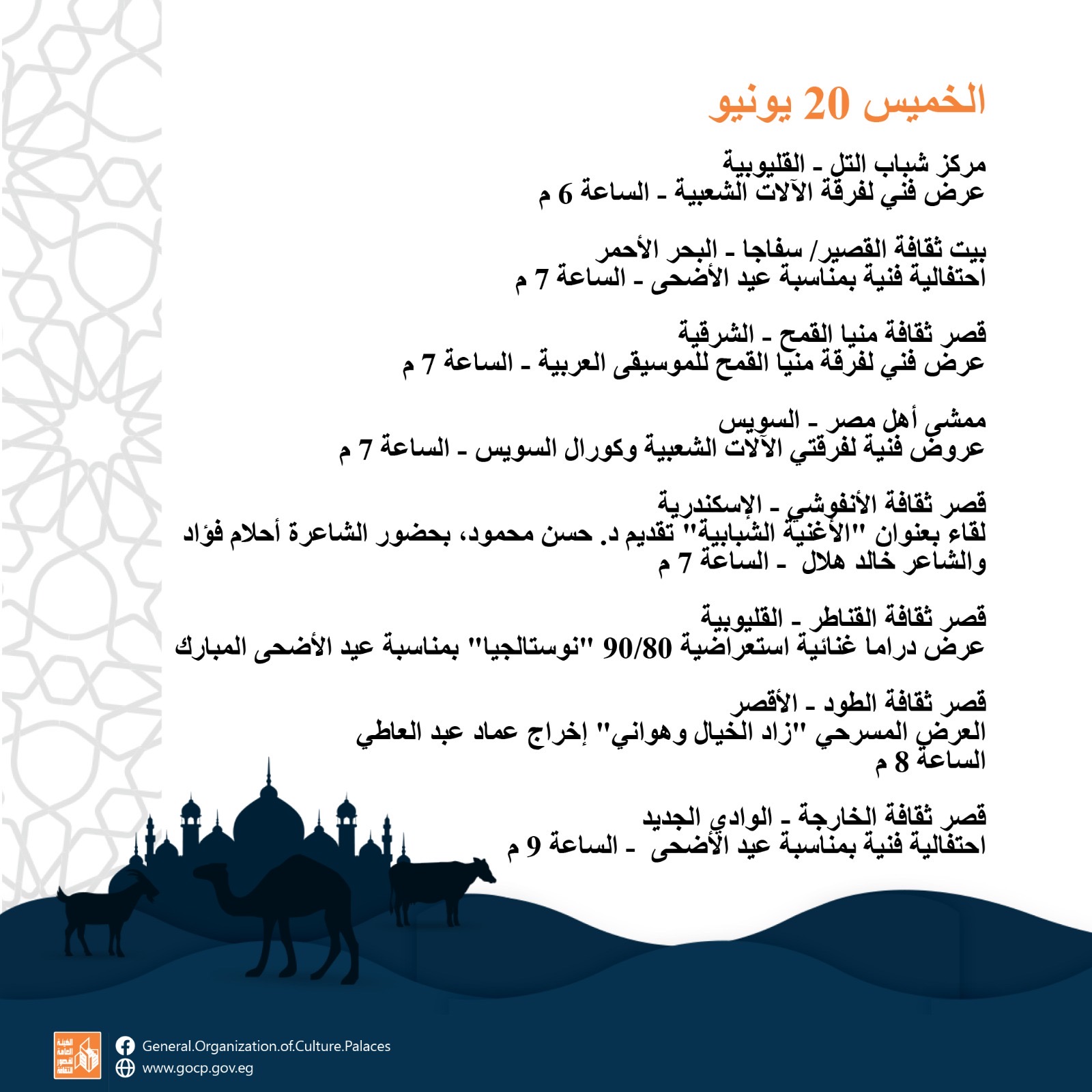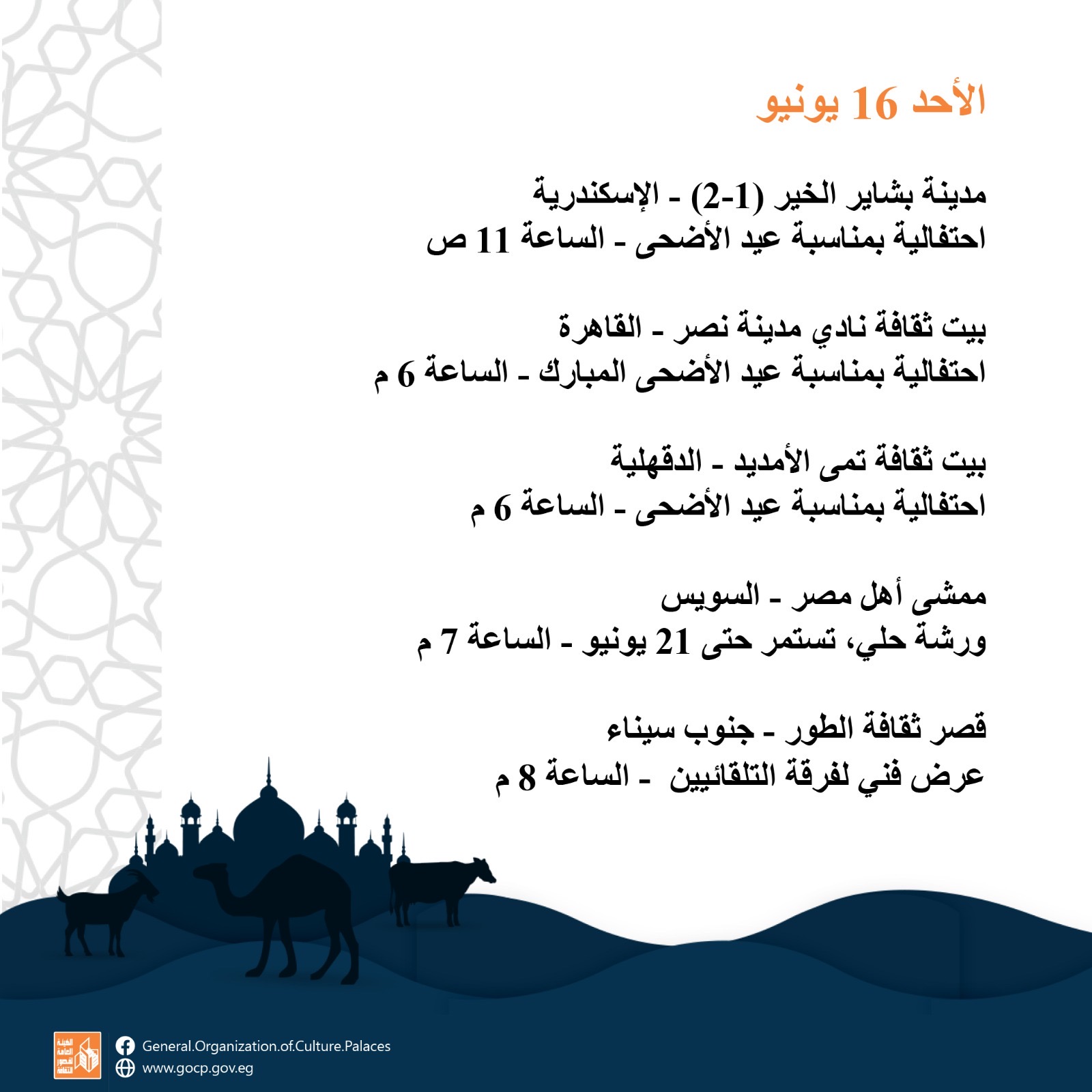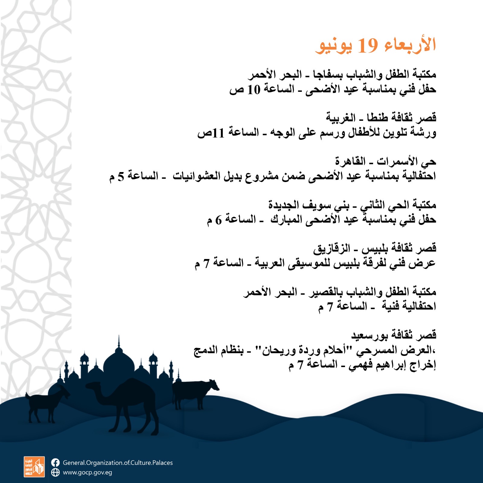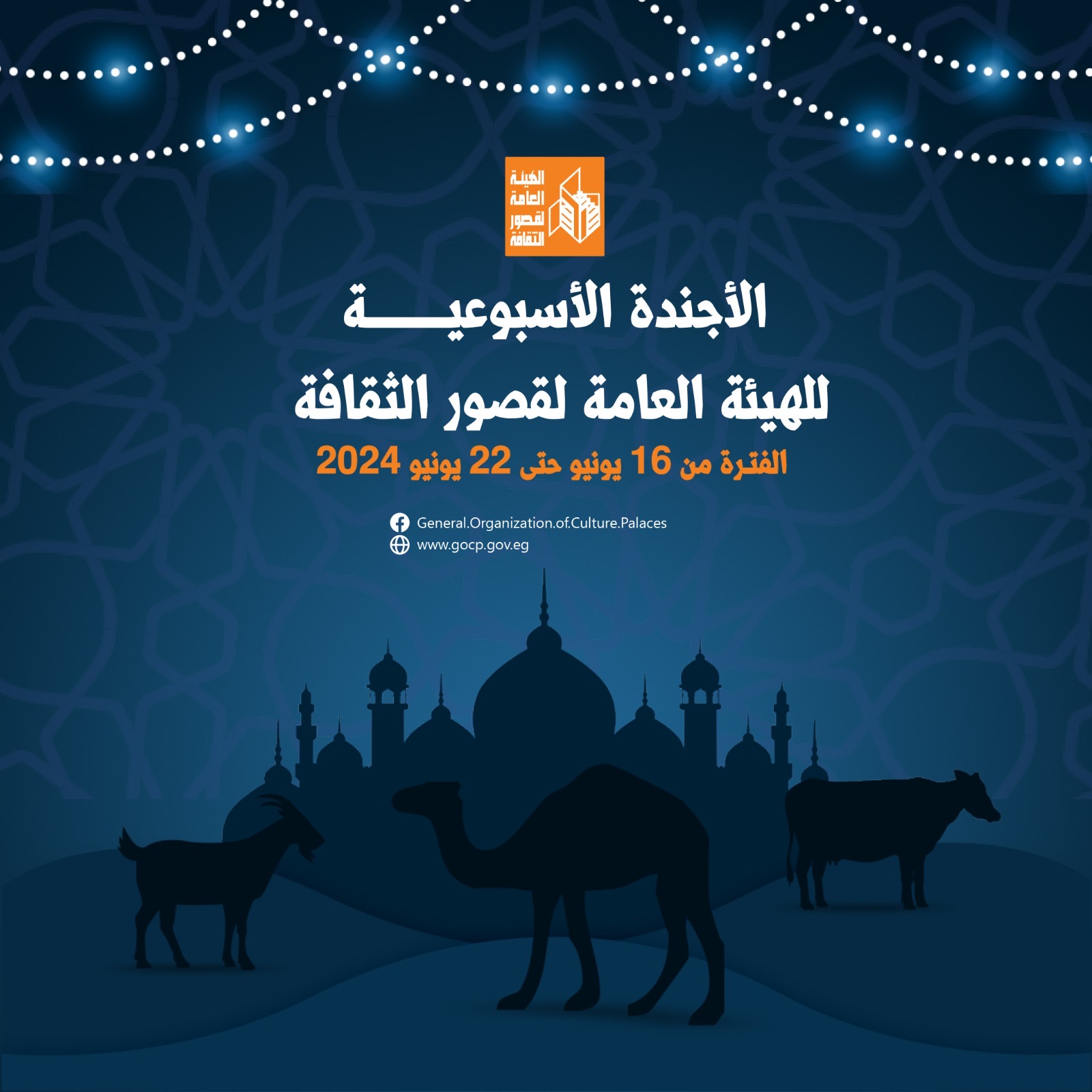 أجندة فعاليات مكثفة وحافلة للهيئة العامة لقصور الثقافة، هذا الأسبوع، تقدمها للجمهور بالقاهرة والمحافظات كافة، ضمن برامج احتفالات وزارة الثقافة بعيد الأضحى المبارك، وبرعاية الدكتورة نيفين الكيلاني، وزير الثقافة، تقدم الهيئة برئاسة عمرو البسيوني، مجموعة مميزة من الفعاليات الثقافية والفنية، بدءا من اليوم الأحد إلى السبت المقبل 22 يونيو.