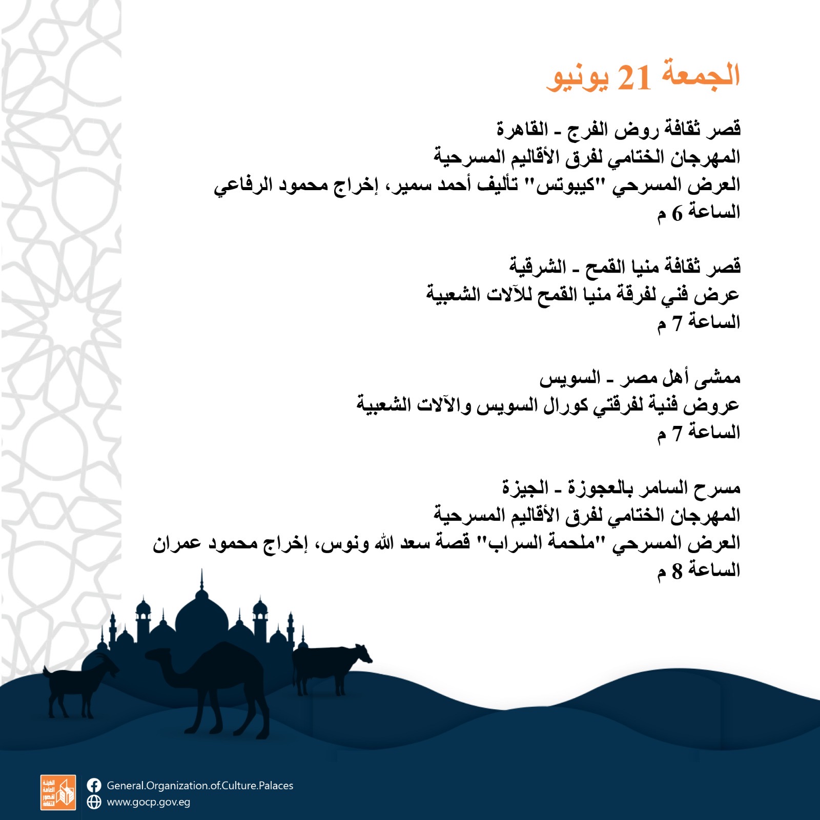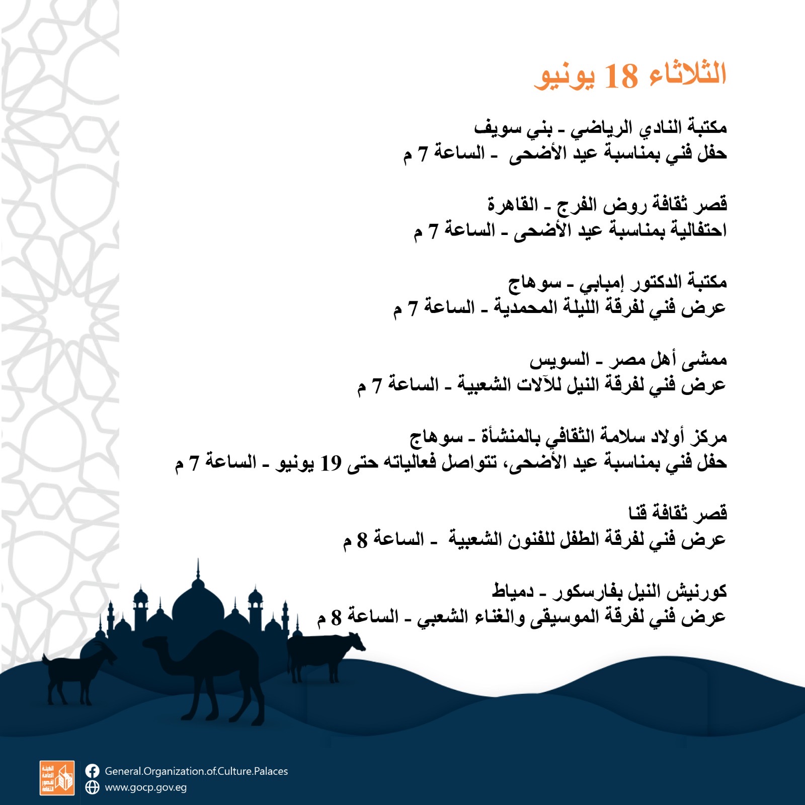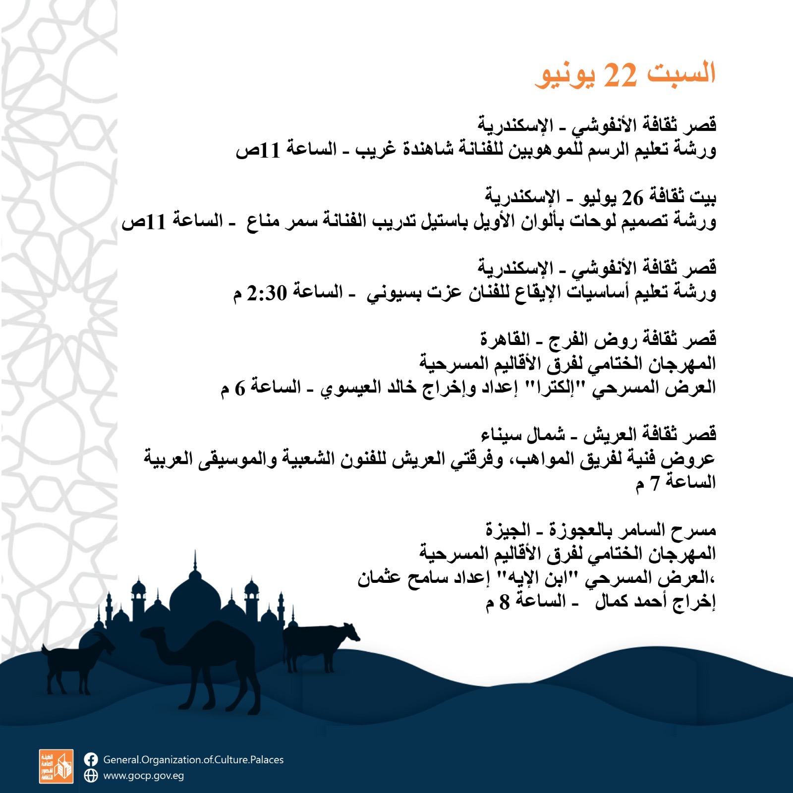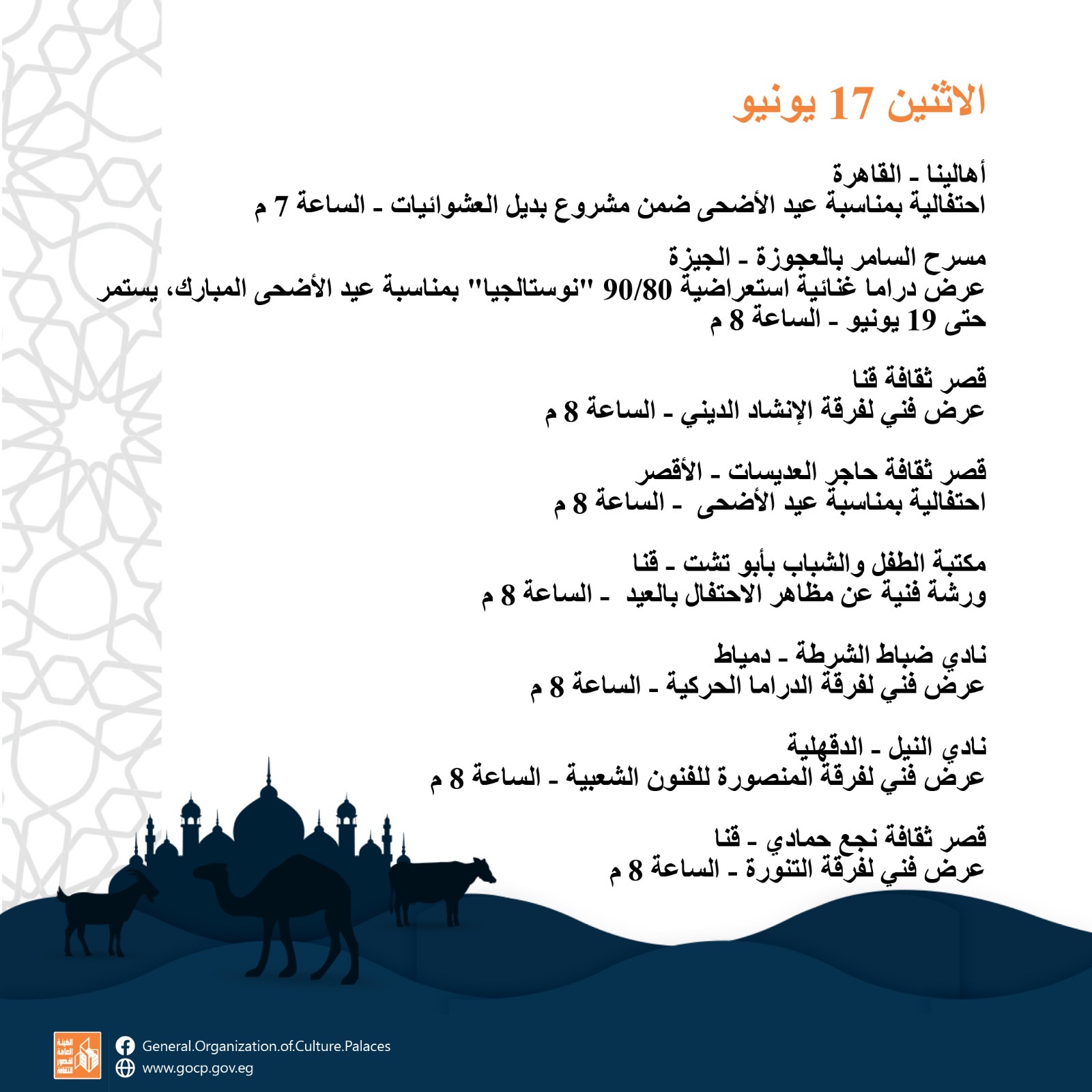 أجندة فعاليات مكثفة وحافلة للهيئة العامة لقصور الثقافة، هذا الأسبوع، تقدمها للجمهور بالقاهرة والمحافظات كافة، ضمن برامج احتفالات وزارة الثقافة بعيد الأضحى المبارك، وبرعاية الدكتورة نيفين الكيلاني، وزير الثقافة، تقدم الهيئة برئاسة عمرو البسيوني، مجموعة مميزة من الفعاليات الثقافية والفنية، بدءا من اليوم الأحد إلى السبت المقبل 22 يونيو.