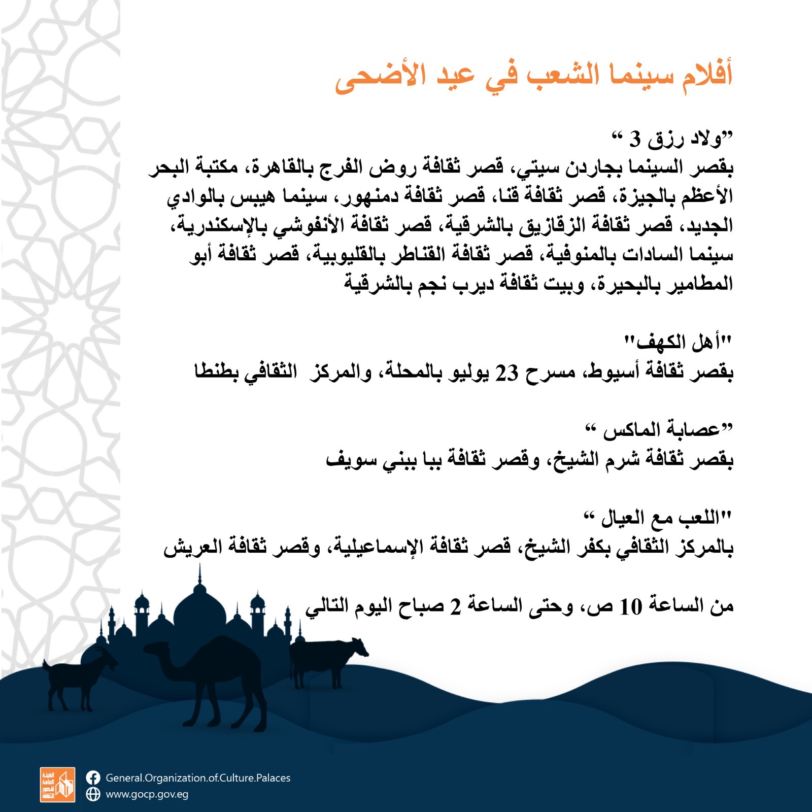 وتعرض الهيئة 4 أفلام جديدة من أفلام موسم عيد الأضحى في 20 موقعًا ثقافيًا تابعًا لها، في 18 محافظة، عبر مشروع “سينما الشعب”، يوميا بدءًا من 10 صباحًا، حتى 2 صباح اليوم التالي، بسعر موحد ومخفض 40 جنيها للتذكرة.