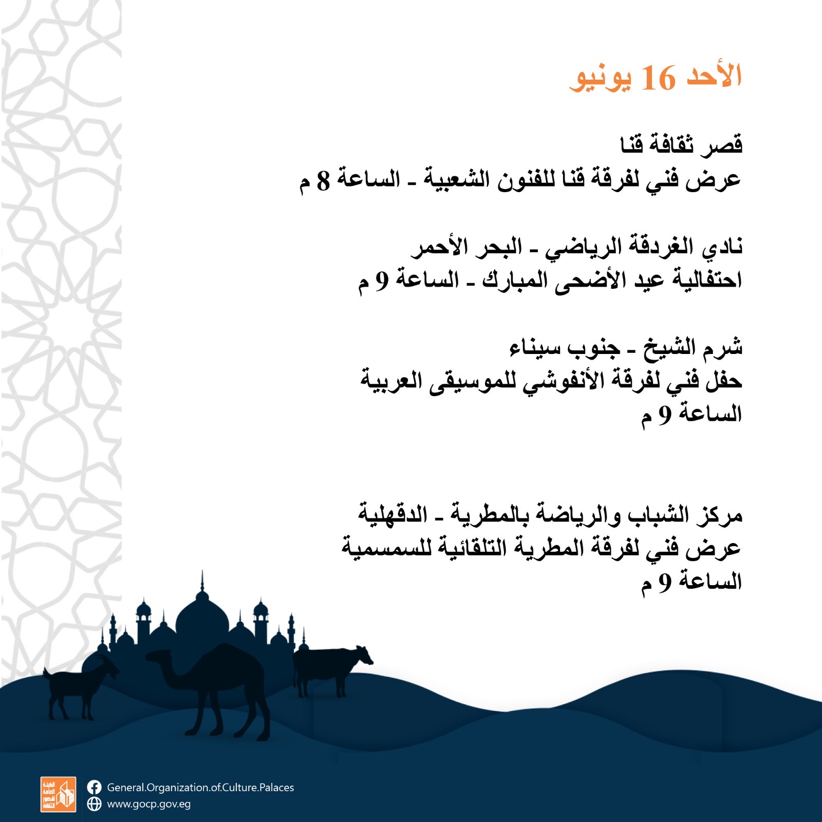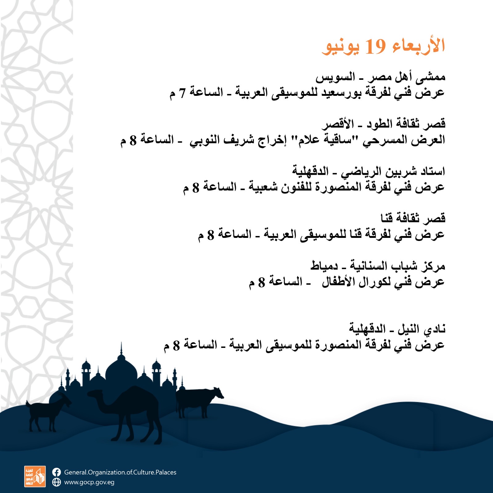 بجانب عروض فرق الآلات الشعبية والموسيقى العربية والإنشاد الديني بجميع المحافظات على مدار أيام العيد.