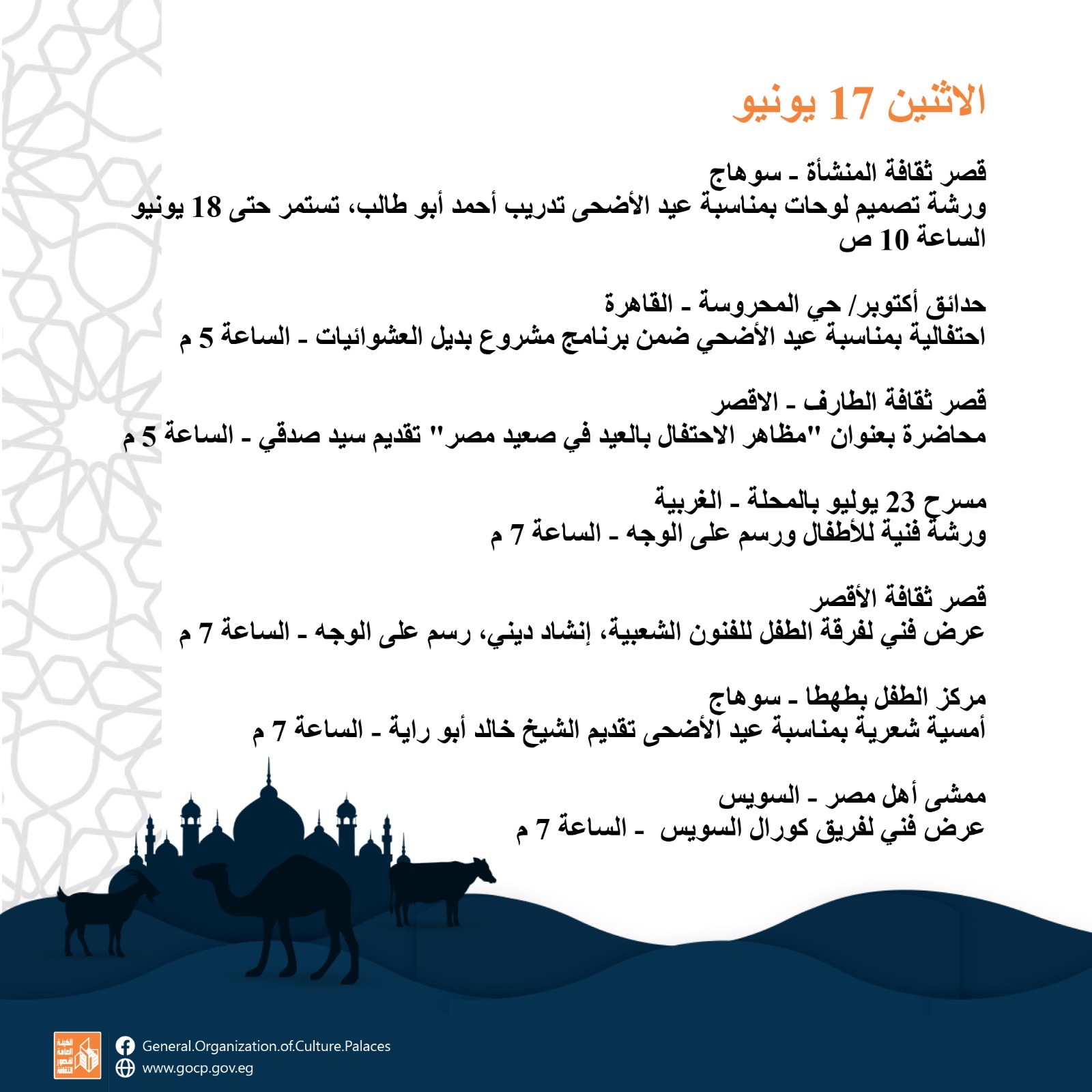 كما تحفل الأجندة الأسبوعية بعدد من الفعاليات المكثفة تقدمها قصور الثقافة بمواقعها الثقافية بالمحافظات تتنوع بين الأمسيات الشعرية والورش الفنية للأطفال واللقاءات والمحاضرات التثقيفية والمسابقات طوال أيام العيد.