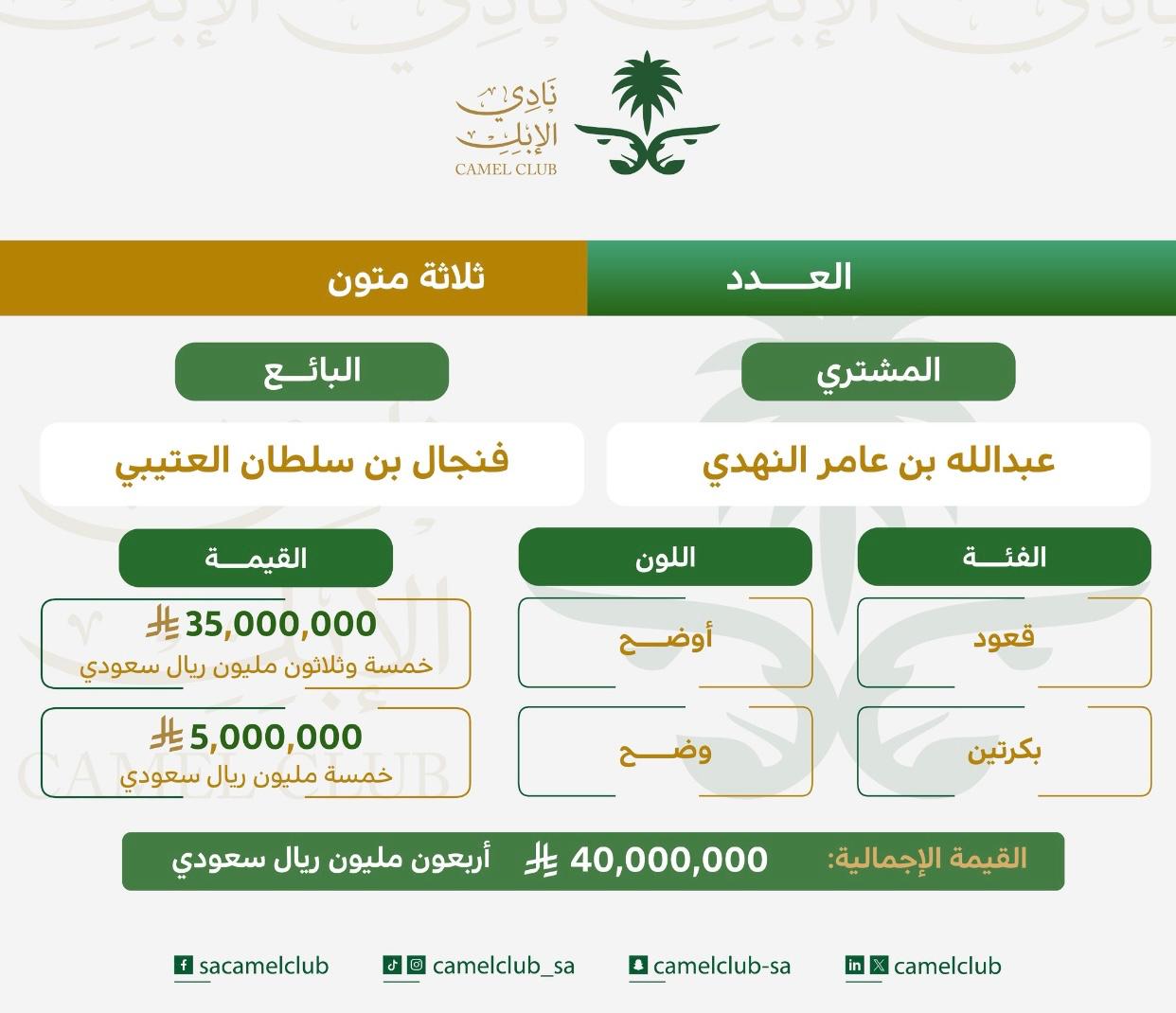 وبينت مؤكد شراء مالك الإبل عبدالله بن عامر النهدي، من مالك الإبل فنجال بن سلطان العتيبي قعود بمبلغ ٣٥ مليون ريال وبكرتين بمبلغ ٥ مليون ريال