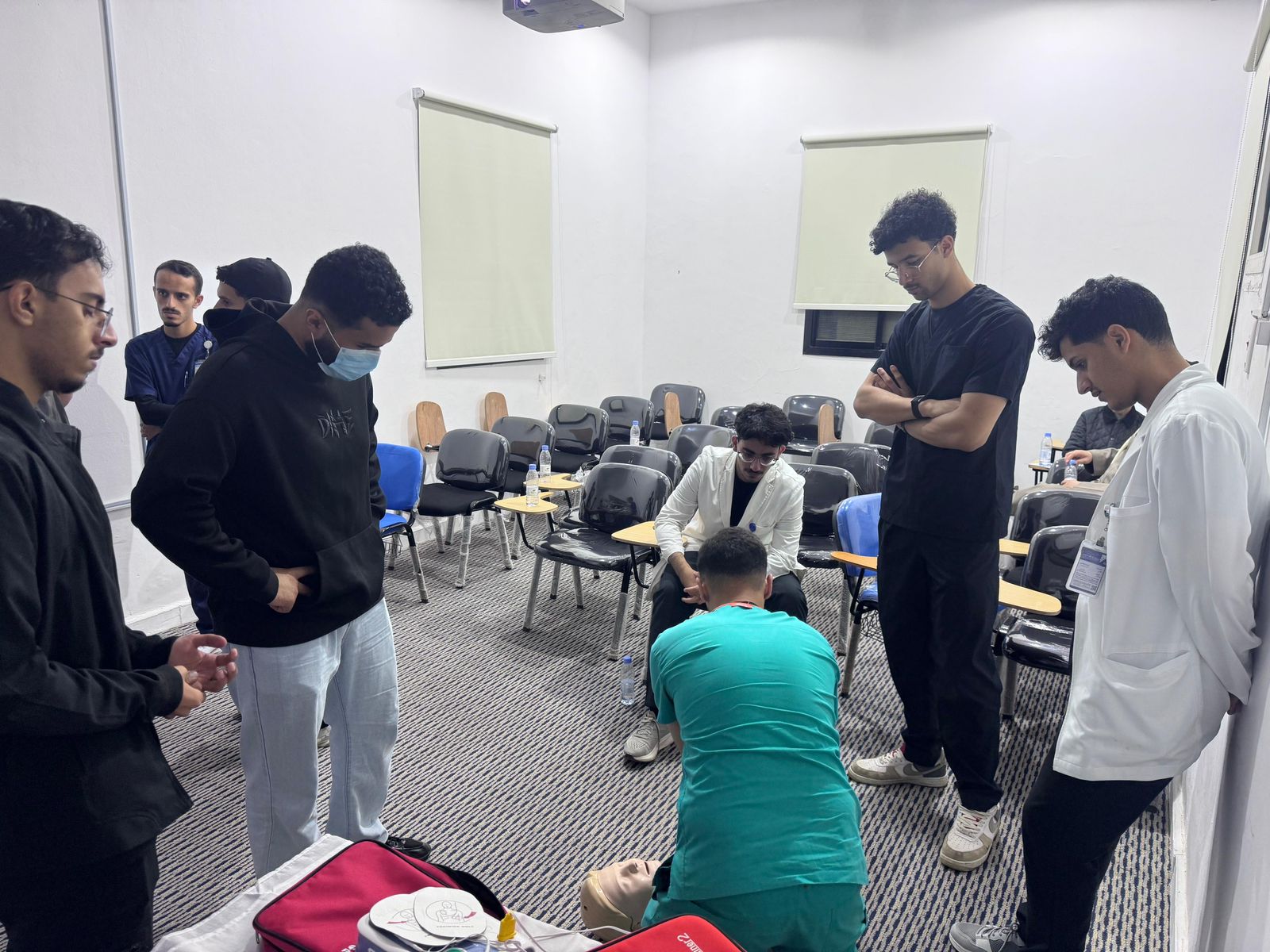 وقد تضمنت ورشة اعداد مدرب على المهارات الاسعافية الاساسية جلسات نظرية وعملية، حيث مارس الطلاب المهارات مباشرة على الأدوات التدريبية تحت إشراف مدربين متخصصين، مما أكسبهم الثقة والمهارة اللازمة لتدريب الآخرين بفاعلية.