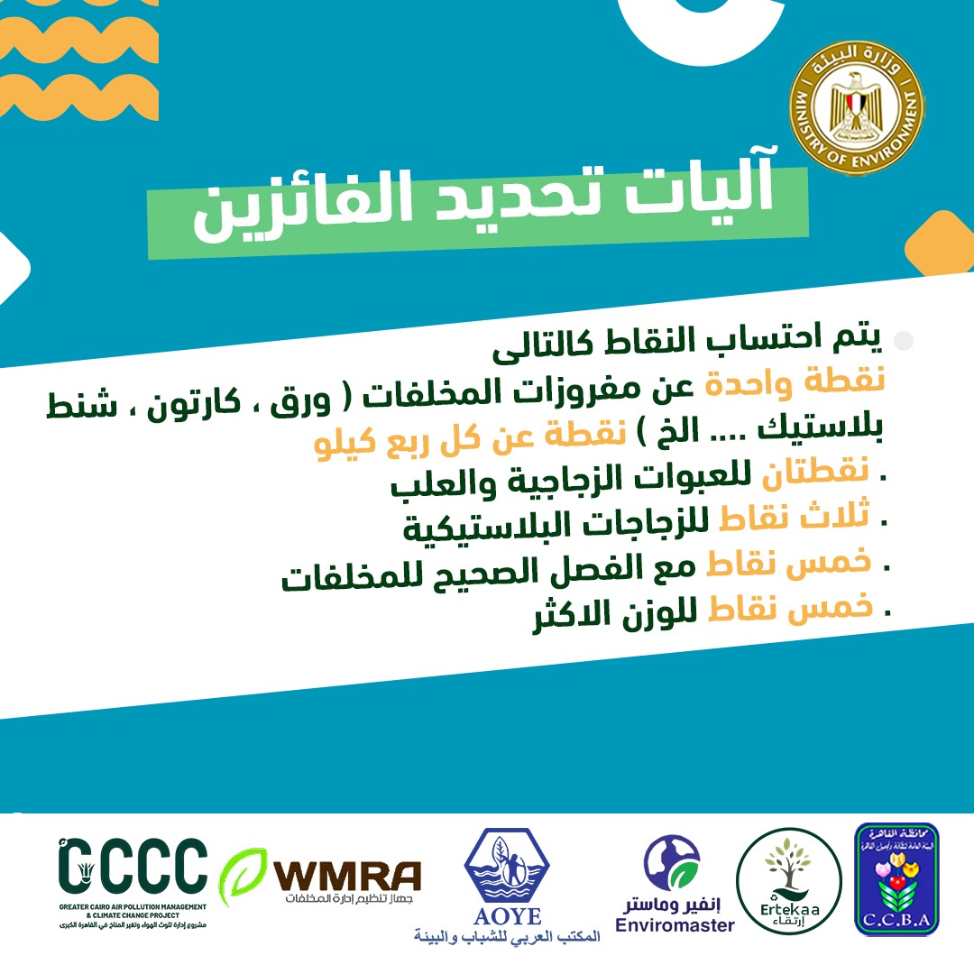 وأضافت سيادتها أنه سيتأهل الى المرحلة النهائية 3 فرق (فريق واحد من كل منطقة)، وتتضمن آليات المسابقة تحديد الفائزين من خلال احتساب عدد من النقاط نقطة واحدة عن القمامة العادية ( ورق ، كارتون ، شنط بلاستيك …. الخ )، نقطة عن كل ربع كيلو ، ونقطتان للعبوات الزجاجية والعلب، وثلاث نقاط للزجاجات البلاستيكية ، وخمس نقاط مع الفصل الصحيح للمخلفات، وخمس نقط للوزن الاكثر ، كما تشمل جوائز المسابقة تقديم جوائز عينية في المرحلة الأولى ، وتقديم جوائز مالية في المرحلة النهائية، وتشمل الجائزة الاولى 9 آلاف جنيه ، والجائزة الثانية 6 آلاف جنيه ، والجائزة الثالثة 3 آلاف جنيه ، كما سيتم توزيع ميداليات ( فضية، وبروزنية، وذهبية) للمشاركين فى النهائيات، على ان يتم تسليم الجوائز النهائية و تسليم كأس البطولة النهائية الى الفريق الفائز الأول ضمن احتفالات يوم البيئة العالمى ٢٠٢٤.