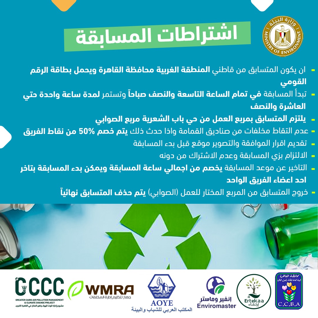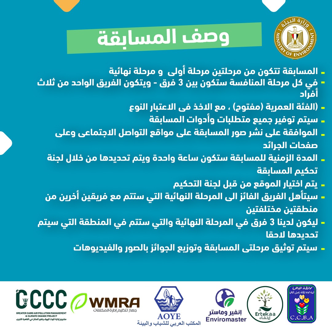 وأوضحت فؤاد، ان المسابقة يتم تنفيذها ، بدعم من مشروع البنك الدولي ” الحد من تلوث الهواء وتغير المناخ في القاهرة الكبرى” وبمشاركة كل من هيئة نظافة وتجميل القاهرة، وشركتى إرتقاء وانفيروماستر للخدمات البيئية، وتأتى فى اطار جهود وزارة البيئة لتعزيز الوعي بأهمية الحفاظ على البيئة من خلال غرس ثقافة النظافة لدى مختلف فئات المجتمع، مع التركيز على مشاركة الشباب كمحركٍ رئيسي للتغيير.