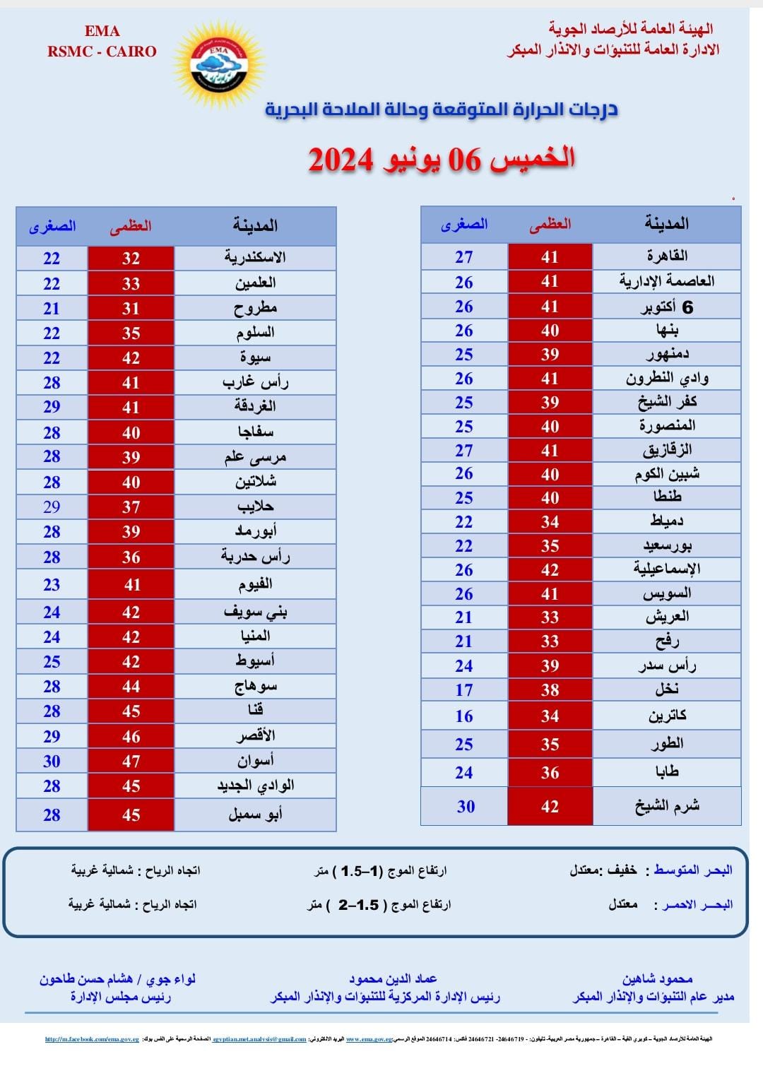 يشهد اليوم الخميس الموافق 6 يونيو ذروة الارتفاع فى درجات الحرارة، فتوقعت الأرصاد أنه يسود طقس شديد الحرارة على أغلب الأنحاء وتتخطى درجات الحرارة العظمى حاجز 40 درجة فى الظل على القاهرة الكبرى.